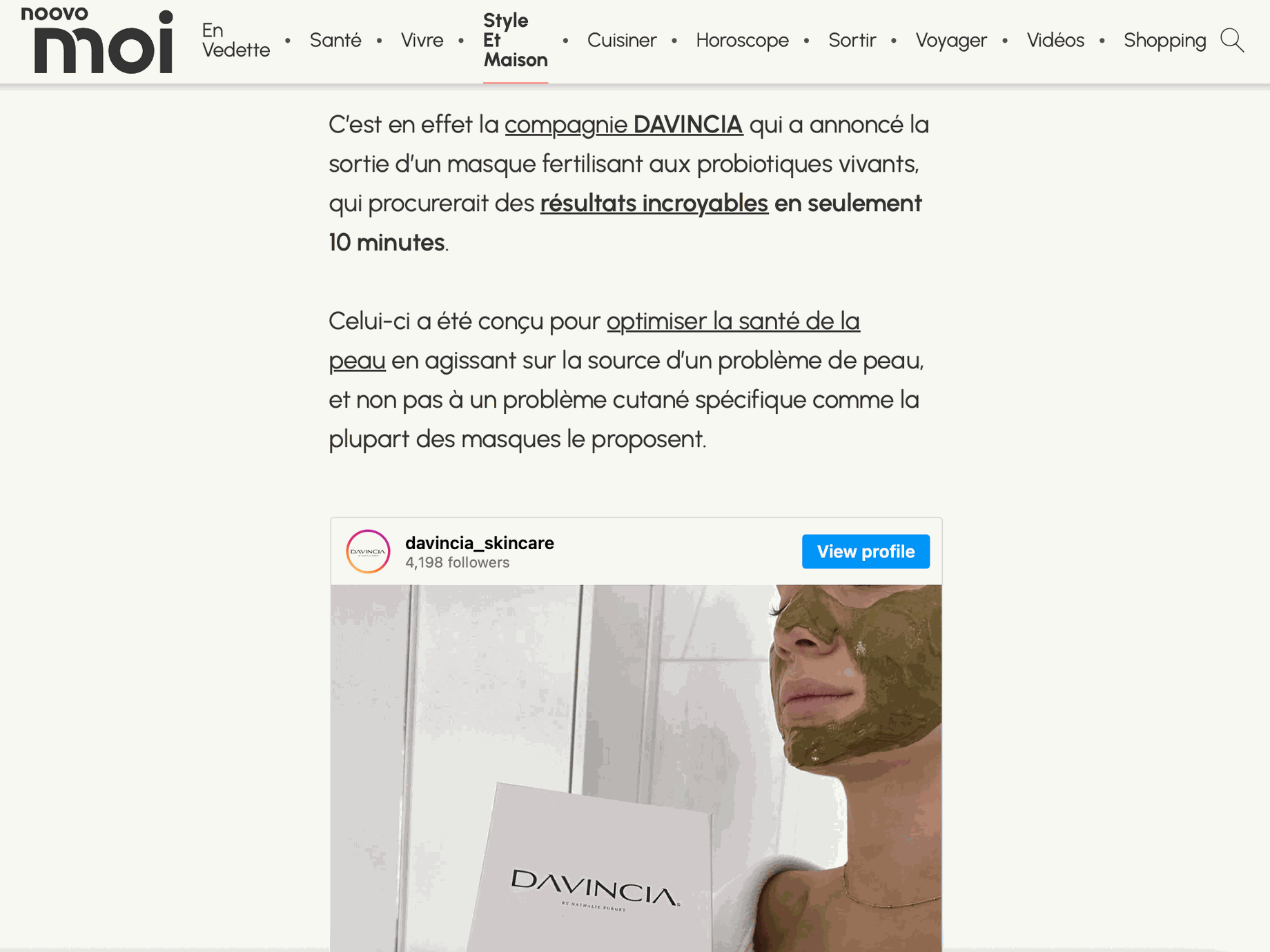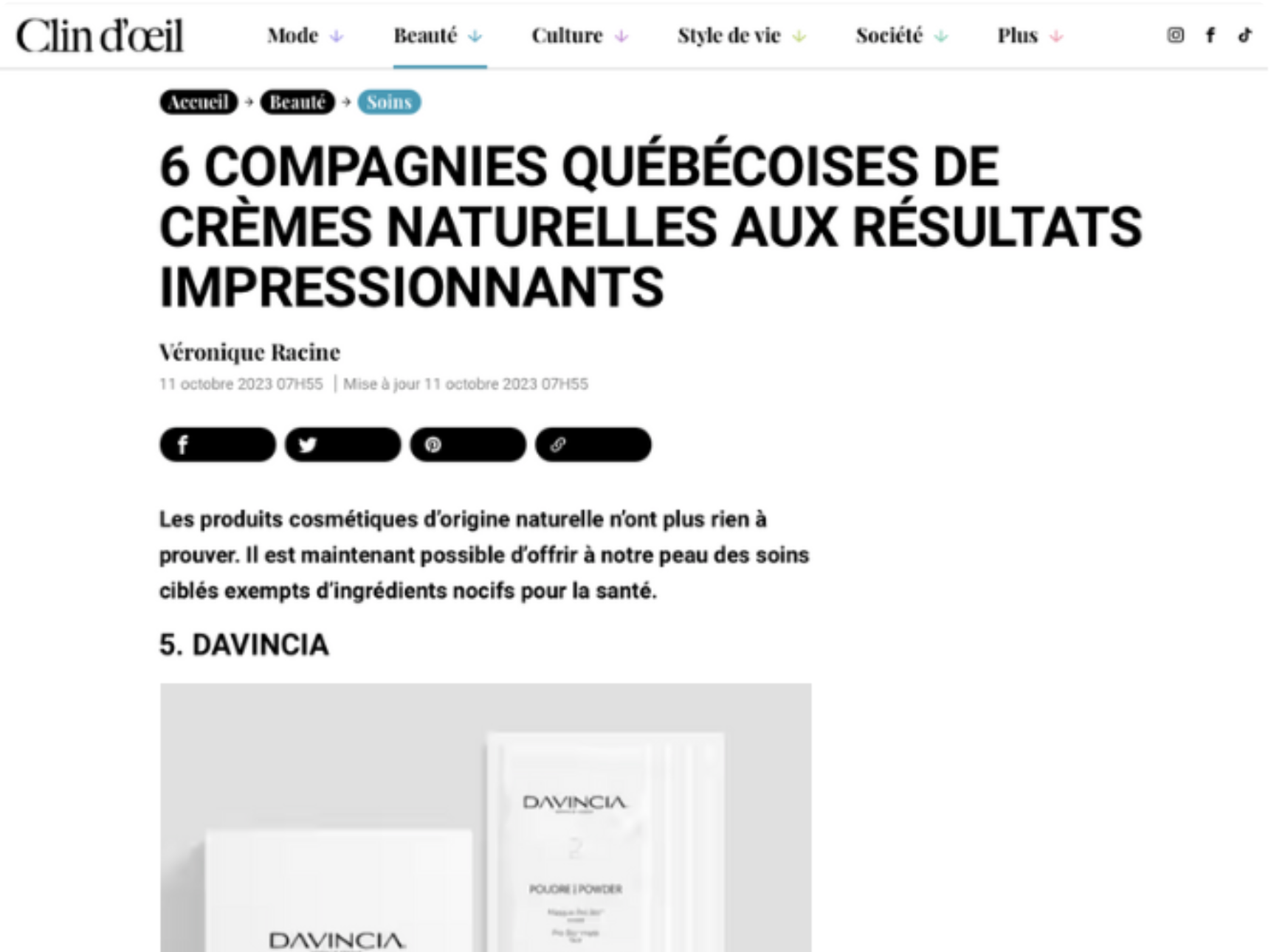 « Pour tout le reste, j'ai arrêté d'essayer tous les nouveaux produits sur le marché et j'utilise désormais exclusivement la marque montréalaise Davincia, 100% naturelle. Et ça marche ! » -Marie-Christine Sirois